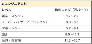エンジニア職(技術職)の給与相場は、新卒で1.7〜2.2万バーツ、マネージャーレベルで5.2〜6.1万バーツ程度です。