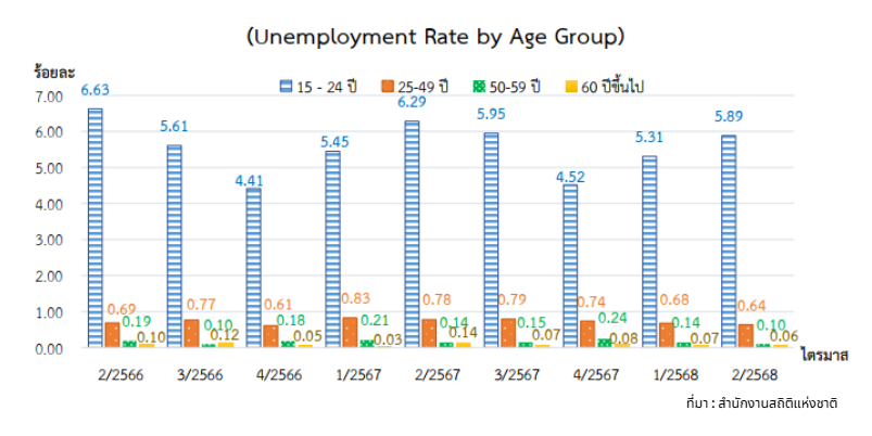 Additionally, according to the Labor Economics Division, Ministry of Labor, the highest unemployment rate in Thailand is among those aged 15–24 (5.89%), which includes students and new graduates. This indicates that the supply of graduates exceeds the labor market demand or that there is a skill mismatch between academic training and market needs. New graduates are at the highest risk of unemployment due to a lack of real work experience, high competition among peers, and misalignment of academic disciplines with available positions.