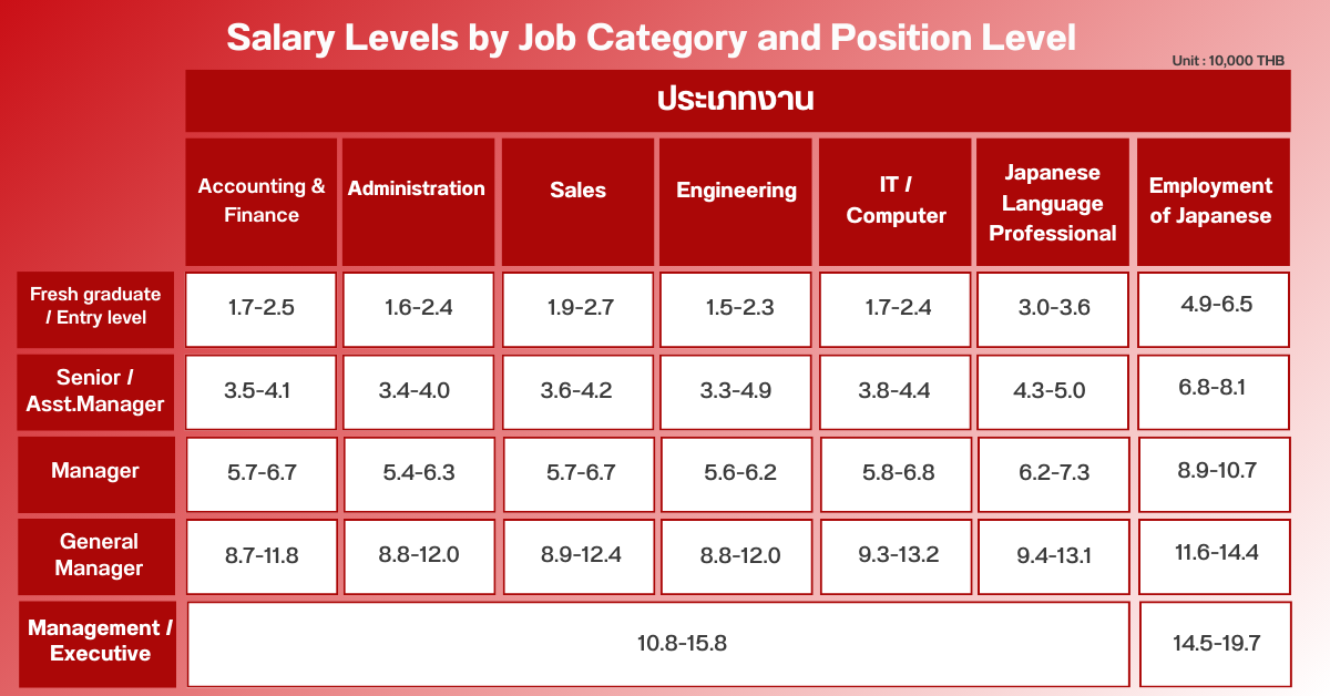 IT remains the most in-demand job category. Entry-level salaries range from THB 17,000–24,000. However, Japanese companies face increasing challenges competing with Thai and Western firms in terms of compensation levels.