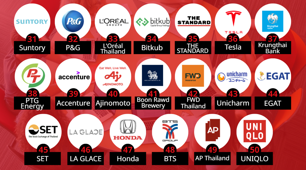 In 2026, as many as seven companies entered the ranking for the first time, including: Uniqlo, Ajinomoto, L’Oréal, La Glace, Tesla, BTS Group, Thai Oil, EGAT, and Honda