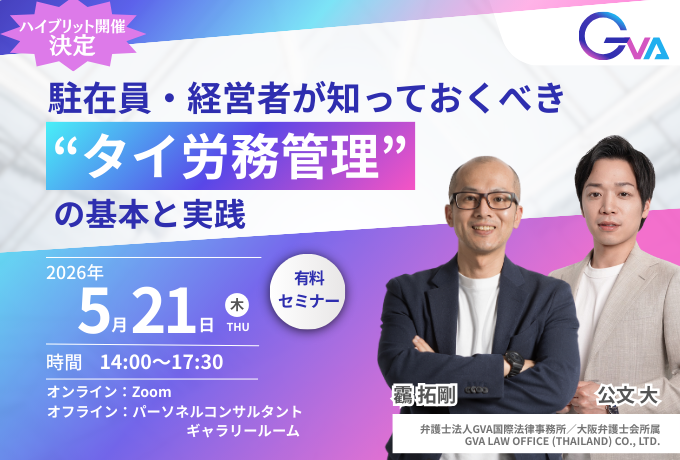 講師は、現地の労務に精通した専門家である靏 拓剛氏ならびに公文 大氏(弁護士法人GVA国際法律事務所/大阪弁護士会所属GVA Law Office (Thailand) Co., Ltd.)です。