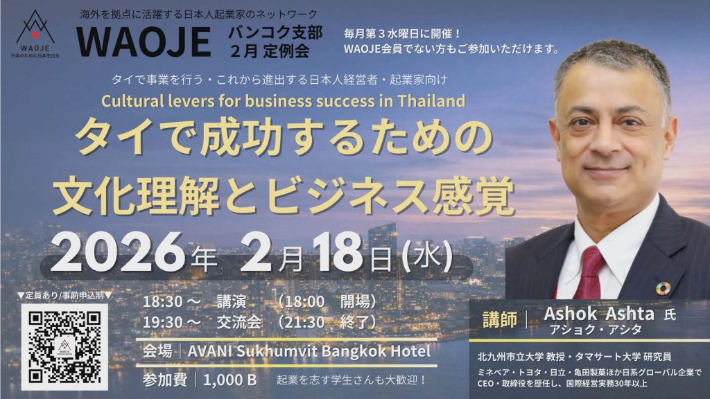 今回のWAOJEバンコク支部定例会では、「タイで成功するための文化理解とビジネス感覚(Cultural levers for business success in Thailand)」をテーマに、日本・アジア・欧米をまたいで30年以上、国際ビジネスの第一線を歩んできた実務家・研究者 アショク・アシタ(Ashok Ashta)氏をお迎えします。