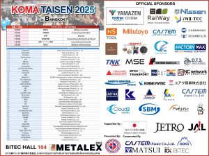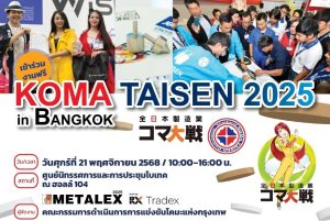 ขอเชิญร่วมชมการแข่งขันลูกข่างเหล็ก “KOMA TAISEN 2025 in Bangkok” ในงาน METALEX2025 ที่ไบเทค บางนา วันศุกร์ที่ 21 พฤศจิกายน เวลา 10:00–16:00 น. งานนี้จัดโดยคณะกรรมการดำเนินการการแข่งขันโคมะแห่งกรุงเทพฯ