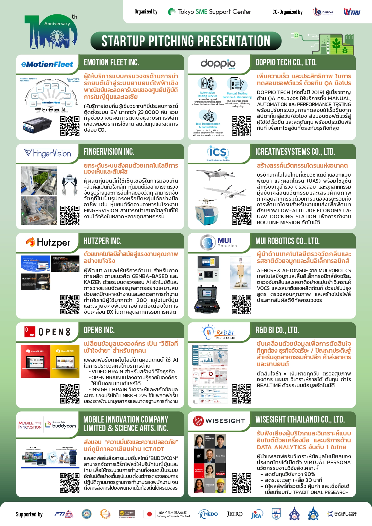 13.10 น. ช่วงแนะนำเทคโนโลยีและสินค้าจากกลุ่มสตาร์ทอัพประเทศญี่ปุ่น-ไทย (10 บริษัท)