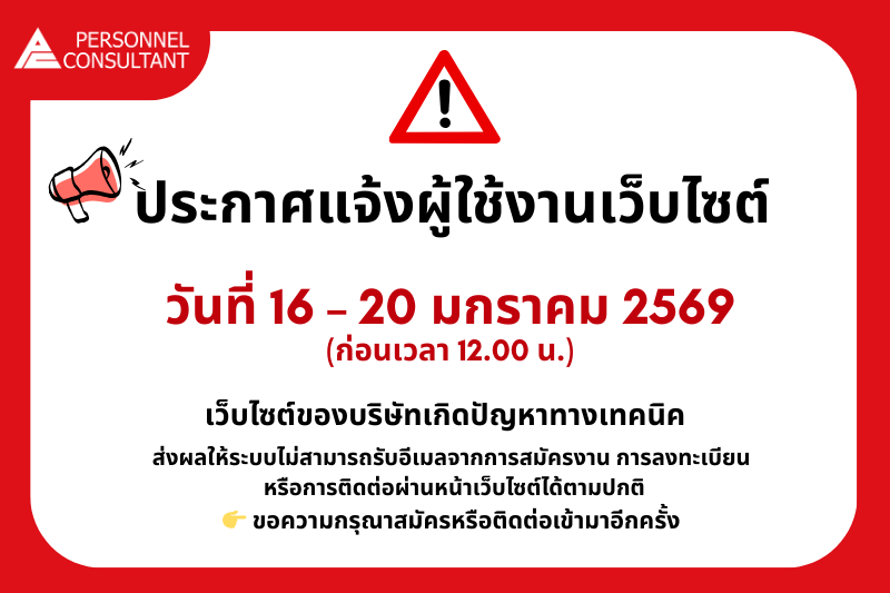 ทางบริษัทขอเรียนแจ้งให้ทราบว่า ในช่วงระหว่างวันที่ 16 มกราคม – 20 มกราคม 2569 เว็บไซต์ของบริษัทเกิดปัญหาทางเทคนิค ส่งผลให้ระบบ ไม่สามารถรับอีเมลจากการสมัครงาน การลงทะเบียน หรือการติดต่อผ่านหน้าเว็บไซต์ได้ตามปกติ
