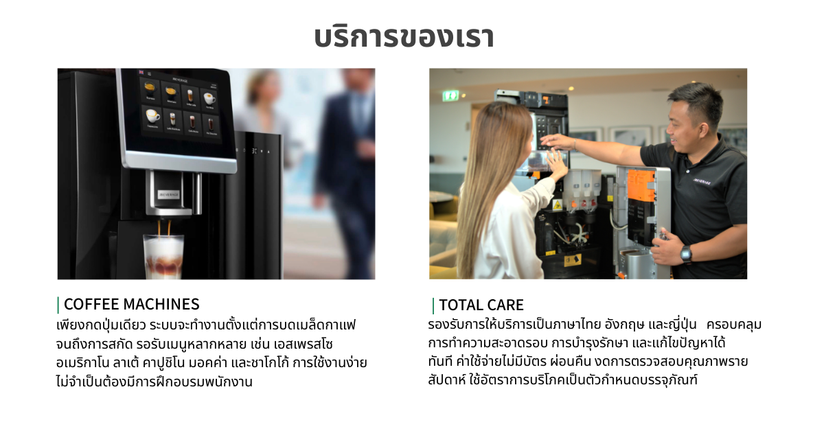 JBEVERAGE (THAILAND) CO., LTD. ปัจจุบันให้บริการมากกว่า 600 แห่ง โดยเน้นพื้นที่บริการในกรุงเทพฯ เป็นหลัก บริการของเราประกอบด้วยการให้เช่าเครื่องชงกาแฟเอสเพรสโซแบบอัตโนมัติสำหรับออฟฟิศ รวมถึงการจำหน่ายวัตถุดิบ เช่น เมล็ดกาแฟ ผงชาโก้ และผงมัทฉะ