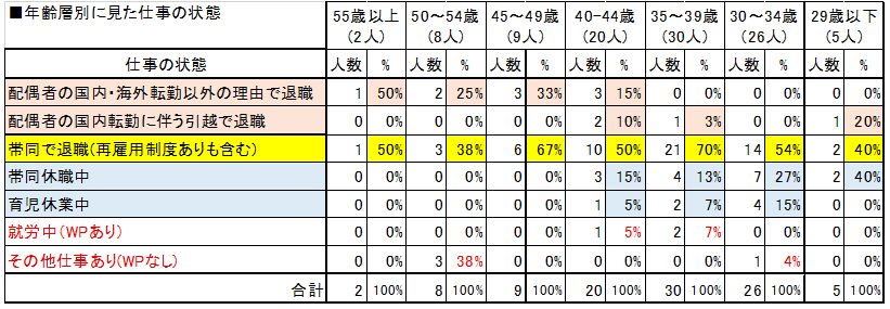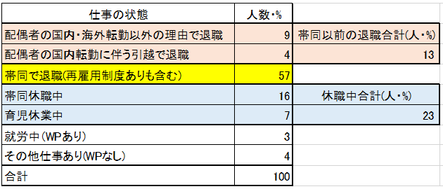 夫の転勤に伴う退職が約6割、現在休職中が23%、一部WPあり就労も
