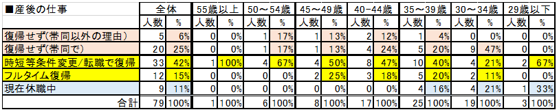 子供がいる79人に限って見た場合、産後復帰した人が6割弱(フルタイム15%、時短など労働条件や雇用形態を変更したり転職したりしての復帰が42%)で、帯同で復帰できなかった/しなかった人が25%でした。このことから、出産自体はもはや勤労継続の障害ではなくなってきている一方で、配偶者の駐在が立ちはだかり、家族が一緒にいることを優先した結果、帯同して現状専業主婦となっているケースが見て取れます。