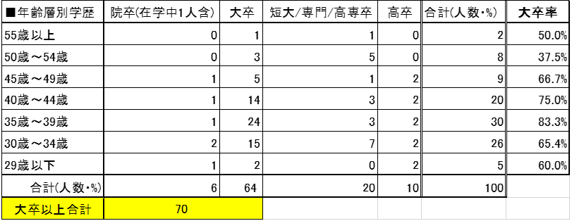 学歴の高さも目を見張ったのですが、一方で、高校・高専・専門学校・短大とその卒業した学校の区分を問わず、社会に出るのが早かった方たちの専門性や仕事に対する意識・責任感に「プロフェッショナル」を感じ、それに感嘆・感動することもしばしばでした。また、ご出身地域の雰囲気やご実家の環境等、または「勉強は嫌い/苦手だった」として進学しなかったと仰っていても、お話ししていると、行かなかっただけで学力が相当に高いと感じる方や、ハッとされられるほど本質を見抜く力を持っている方が多かったのが印象的です。