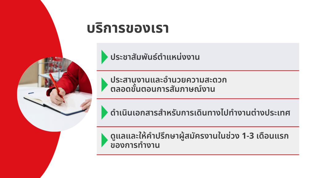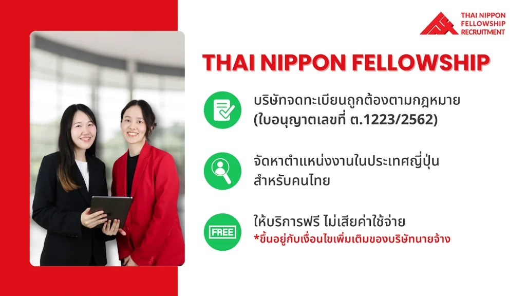 Thai Nippon Fellowship Recruitment เป็นบริษัทที่ให้บริการด้านการจัดหางานสำหรับบุคลากรไทยที่ต้องการทำงานที่ประเทศญี่ปุ่น ให้คำปรึกษา ประสานงาน ช่วยเหลือด้านเอกสารวีซ่าทำงานทุกขั้นตอน จนถึงไปทำงานที่ญี่ปุ่น บริการของเรา ฟรีทุกขั้นตอน ไม่มีค่าใช้จ่าย!