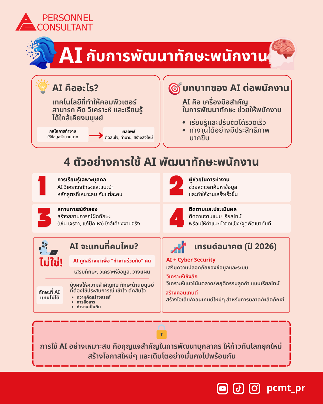 ด้วยการใช้ AI อย่างเหมาะสม พนักงานและองค์กรจะสามารถเรียนรู้ ปรับตัว และสร้างโอกาสใหม่ ๆ ไปพร้อมกัน ทำให้ทั้งบุคลากรและองค์กรสามารถก้าวทันโลกของการทำงานยุคใหม่ได้อย่างมั่นคง