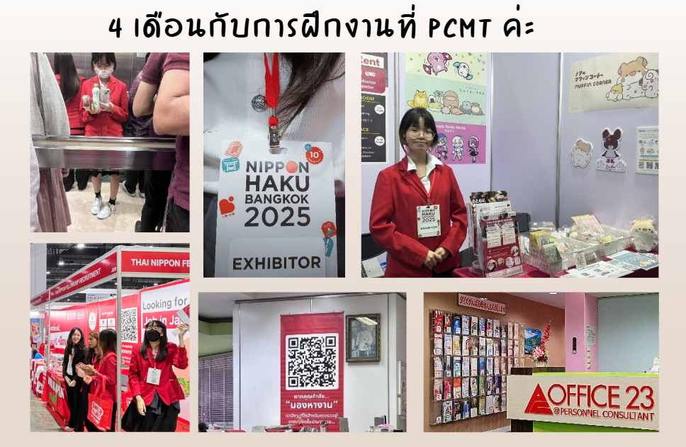 ประสบการณ์ใหม่คือการช่วยยืนประจำบูธในงานนิปปอนฮาคุค่ะ เป็นครั้งแรกที่ได้ทำงานแบบนี้ เวลาเจอลูกค้าถามคำถามที่ตอบไม่ได้ก็ต้องขอความช่วยเหลือพี่ ๆ แต่ก็มีโมเมนต์ที่ภูมิใจในตัวเองที่เชิญชวนลูกค้ามาลงทะเบียนสมัครงานได้ค่ะ