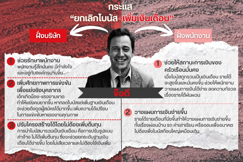 1.ช่วยให้สถานะการเงินของครัวเรือนมั่นคง การใช้ระบบนี้จะช่วยให้สถานะการเงินของครัวเรือนของพนักงานมีความมั่นคงมากขึ้นเนื่องจากส่วนของโบนัสถูกนำมาบวกเพิ่มในเงินเดือนทุกเดือน ทำให้เงินสุทธิที่ได้รับต่อเดือนเพิ่มขึ้น ข้อดีคือได้รับเงินก้อนที่แน่นอนทุกเดือน ทำให้วางแผนค่าใช้จ่ายรายเดือนได้ง่าย คลายความกังวลเรื่องรายได้ที่ผันผวนจากโบนัสก็จะลดลง ในยุคที่ภาวะเงินเฟ้อและค่าครองชีพสูงขึ้นเรื่อยๆ การที่เงินเดือนเพิ่มสูงขึ้น ก็จะช่วยตอบโจทย์และแก้ปัญหาการเงินให้กับพนักงานอีกด้วยซึ่งถือเป็นจุดที่น่าสนใจ