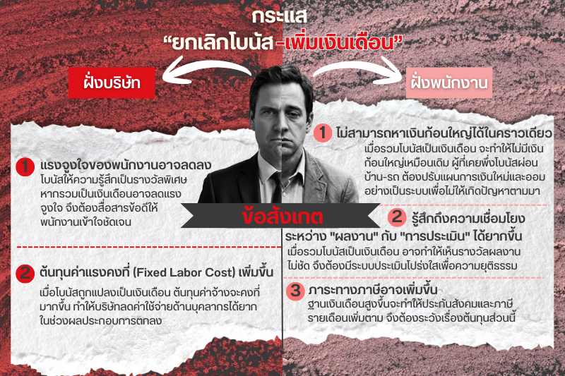 “เราเริ่มดำเนินการปรับโบนัสบางส่วนเข้ามาเป็นเงินเดือนตั้งแต่ปีที่ผ่านมา โดยเริ่มจากสัดส่วนประมาณ 1 ใน 8 ของโบนัส ซึ่งถือว่ายังไม่ใช่จำนวนเงินที่สูงมากนัก แม้เราจะยังไม่แน่ใจว่าจะก้าวไปถึงขั้นยกเลิกโบนัสทั้งหมดแบบที่ Sony ทำหรือไม่ แต่เรามีแผนที่จะขยายสัดส่วนนี้เพิ่มขึ้นในอนาคตอย่างแน่นอน” — ผู้บริหารจากกลุ่มอุตสาหกรรมอิเล็กทรอนิกส์ (Electronics)