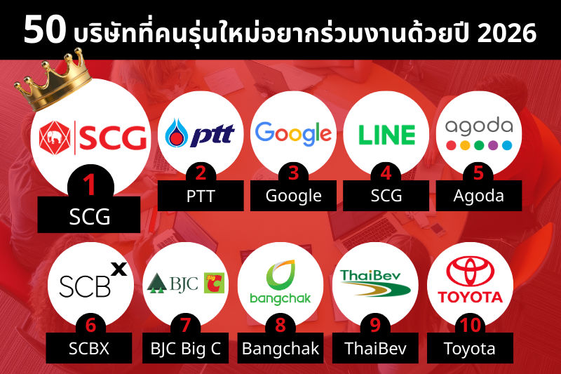 ปีนี้มีเรื่องเซอร์ไพรส์ตั้งแต่สามอันดับแรก เมื่อ SCG (เอสซีจี) สามารถเบียดเอาชนะ Google แชมป์เก่าลงไปอยู่อันดับ 3 ได้สำเร็จ โดยมี ปตท. (PTT) ครองอันดับ 2 ซึ่งสะท้อนว่าคนรุ่นใหม่เริ่มกลับมาให้ความสำคัญกับองค์กรไทยขนาดใหญ่ที่มีความมั่นคงสูง แต่มีการปรับตัวสู่ Digital Transformation อย่างเต็มรูปแบบ ผลสำรวจปี 2026 เปิดเผยภาพที่น่าสนใจหลายประเด็น ไม่เพียงแค่ชื่อบริษัทยอดนิยมแต่ยังชี้ให้เห็นทิศทางความคิดและความคาดหวังของคนรุ่นใหม่ต่อโลกการทำงานในวันนี้ ในช่วง 5 ปีที่ผ่านมา ตลาดแรงงานไทยเปลี่ยนแปลงอย่างรวดเร็ว ไม่เพียงเพราะเทคโนโลยีหรือเศรษฐกิจโลก แต่ยังเกิดจาก “มุมมองของคนรุ่นใหม่” ที่มีต่อการทำงานแตกต่างจากอดีตอย่างชัดเจน บริษัทที่ติดโพลต่อเนื่องหลายปี เช่น Google, PTT, SCG, LINE, Agoda และ ThaiBev จะพบจุดร่วมที่สำคัญคือ ไม่ใช่ทุกบริษัทจะเป็น Tech Company แต่ทุกบริษัทมี “ระบบการทำงานที่ชัดเจน” ปัจจัยที่ทำให้บริษัทเหล่านี้รักษาความนิยมได้