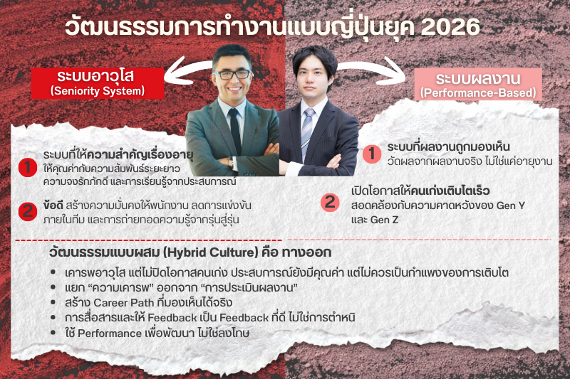 แนวโน้มที่เห็นชัดในปี 2026 บริษัทญี่ปุ่นจำนวนมากเลือกใช้ วัฒนธรรมแบบผสม (Hybrid Culture) คือ ไม่ทิ้งระบบอาวุโส แต่ปรับให้ยืดหยุ่นและเชื่อมกับ Performance