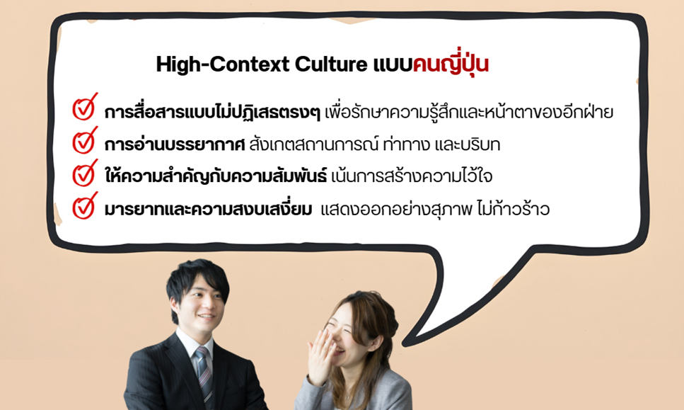 1.การสื่อสารแบบนัย (Implicit & Indirect): มักไม่ปฏิเสธตรงๆ หรือพูดเรื่องลบตรงๆ เพื่อรักษาความรู้สึกและหน้าตาของอีกฝ่าย