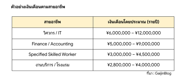 หากคิดเป็นรายปี ตัวเลขจะอยู่ราว ¥4.6M – ¥4.8M / ปี (ขึ้นอยู่กับสาขาอาชีพและทักษะของแต่ละคน)