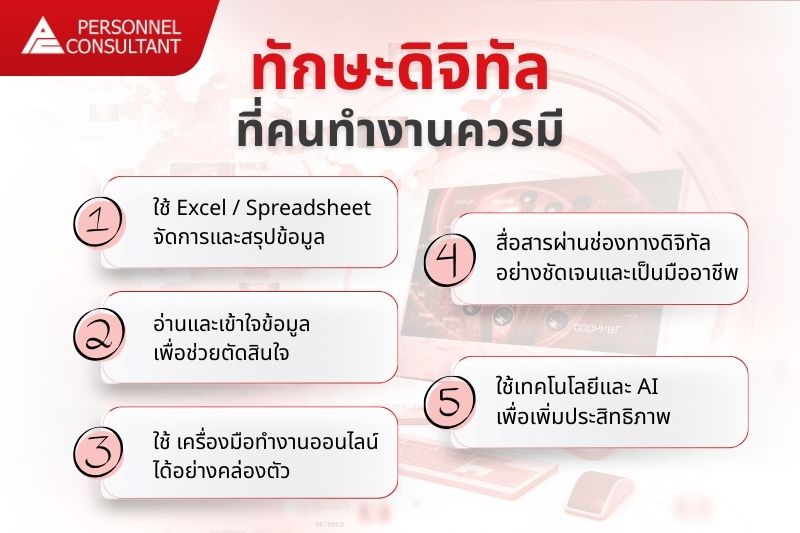 จากประสบการณ์ในสายงาน Recruitment ทักษะดิจิทัลพื้นฐานเป็นอีกหนึ่งองค์ประกอบที่องค์กรใช้ในการพิจารณาผู้สมัคร โดยเฉพาะในตำแหน่งที่ต้องทำงานกับข้อมูลหรือประสานงานกับหลายฝ่าย