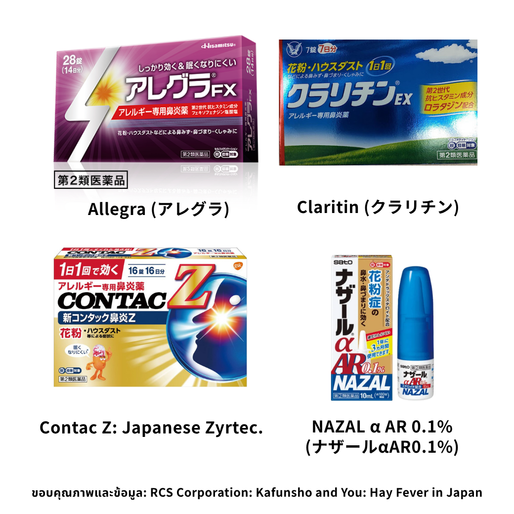 สำหรับผู้ที่มีอาการแพ้ละอองเกสรในประเทศญี่ปุ่น การเลือกซื้อยาตามร้านขายยาทั่วไป เป็นวิธีที่สะดวกที่สุด โดยมีตัวเลือกที่ได้รับความนิยมดังนี้: